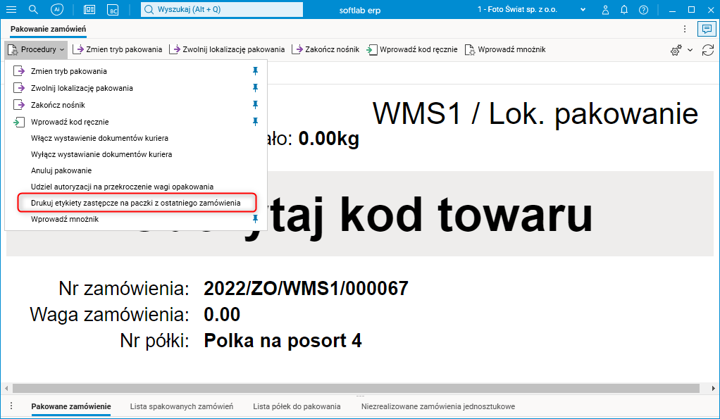 Po spakowaniu całego zamówienia w słowniku Pakowanie zamówień system Softlab ERP komunikuje się z zewnętrznymi systemami firm kurierskich w celu automatycznego pobrania etykiety kurierskiej oraz jej wydrukowania. Do tej pory, w sytuacji, gdy taki wydruk się nie powiódł, to proces pakowania był kontynuowany, ale nie było możliwości wydrukowania etykiety dla zamówienia.