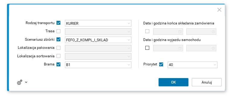 W przypadku użycia procedury dla jednego dokumentu, jej parametry zostaną zainicjowane wartościami pobranymi z tego dokumentu, np. gdy na dokumencie jest zdefiniowana brama, to pole wyboru przy parametrze Brama będzie zaznaczone, a na liście wyboru bramy zostanie zainicjowany symbol bramy z dokumentu.