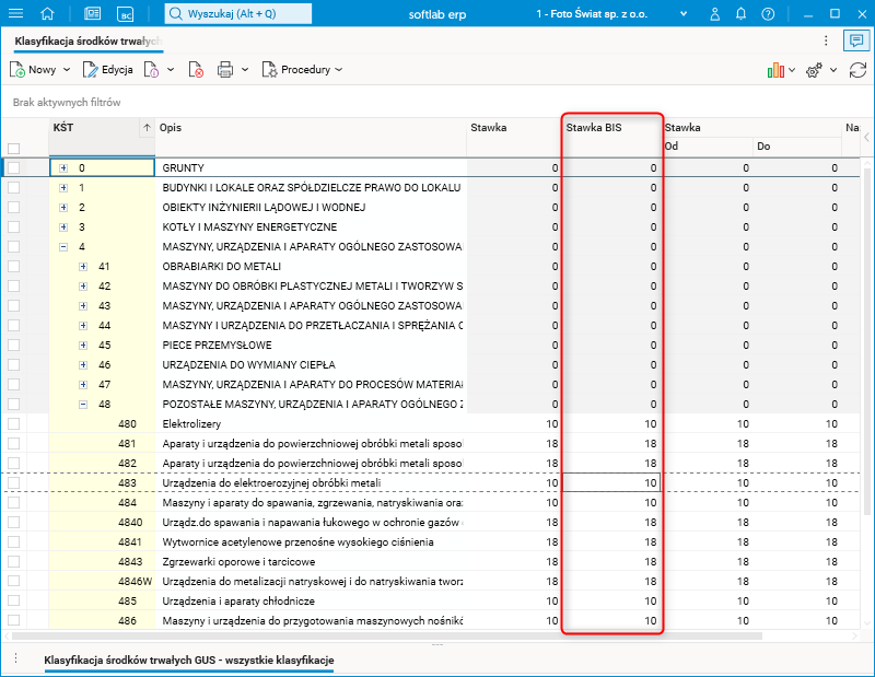 W słowniku Klasyfikacja środków trwałych dodano nową kolumnę Stawka BIS. Kolumna ta jest uzupełniona wartościami z kolumny Stawka. Wartości w obu kolumnach mogą być zmieniane przez użytkownika.