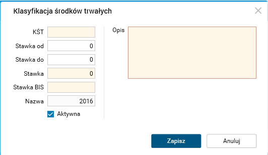 Rys. Okno edycyjne Klasyfikacja środków trwałych