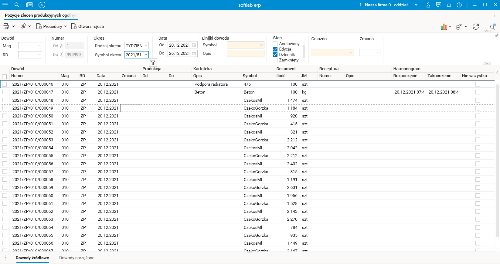 Przeglądarka znajduje się w słowniku Pozycje zleceń produkcyjnych ogólnych . Słownik umożliwia wyszukiwanie zleceń wg zadanego okresu planistycznego (grupa filtrów Okres). W słowniku widoczne są najważniejsze informacje pochodzące z nagłówka zlecenia: numer dowodu, data zlecenia (grupa kolumn Dowód), planowana data produkcji (grupa kolumn Produkcja) oraz pochodzące z jego linijek: symbol i opis produktu (grupa kolumn Kartoteka), ilość zlecona do produkcji (grupa kolumn Dokument) oraz ramy czasowe harmonogramu produkcji (grupa kolumn Harmonogram).