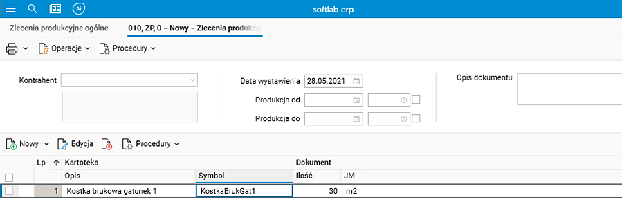 Proces rozpoczyna się od wystawienia zlecenia produkcyjnego ZP na kostkę brukową w zamówionej ilości.
