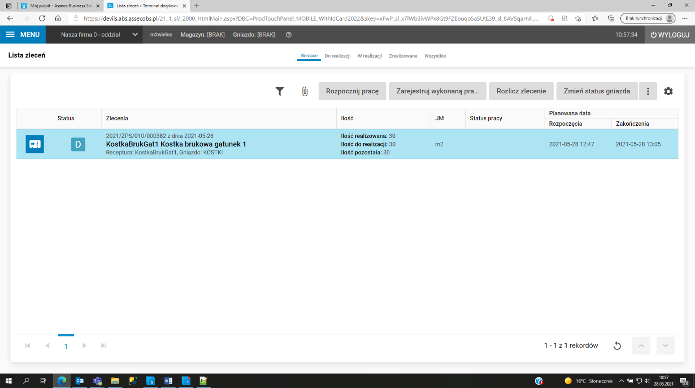 Operator logując się na panelu dotykowym widzi zlecenie realizacji produkcji kostki brukowej, które zostało wcześniej przekazane do realizacji.
