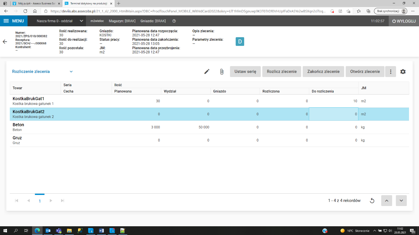 Następnie wchodzi do zlecenia i w szczególe Rozliczenie zlecenia , w kolumnie Do rozliczenia wprowadza ilość wytworzonej partii wyrobu. W wyniku produkcji kostki może też powstawać wyrób w 2-gim gatunku (na recepturze jest on oznaczony jako produkt uboczny).