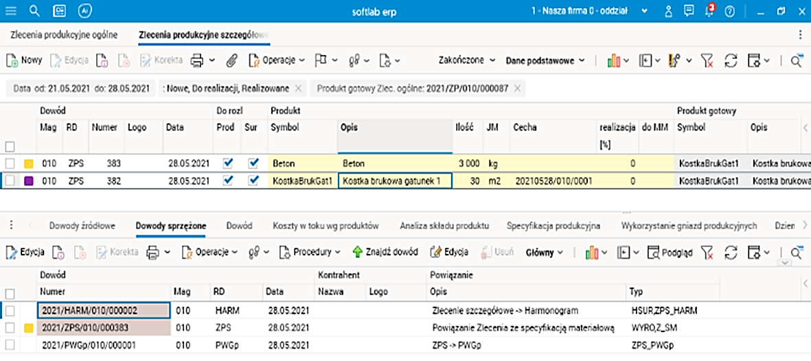 Dokument należy zatwierdzić w celu dalszej realizacji procesu. W wyniku zatwierdzenia ZP powstają sprzężone dokumenty ZPS na poszczególne etapy produkcji (produkcja betonu i produkcja kostki).