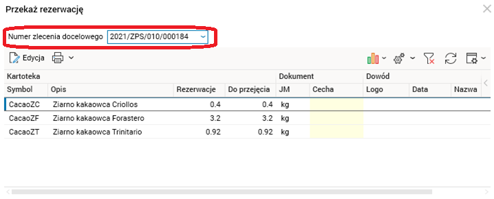 Chcąc przenieść rezerwację w polu Numer zlecenia docelowego (oznaczone na rysunku kolorem czerwonym) należy wskazać zlecenie, na które ma zostać przeniesiona rezerwacja. W kolumnie Kartoteka;Rezerwacje wyświetlona jest informacja o ilości rezerwacji możliwej do przeniesienia, natomiast ilość rezerwacji do przekazania należy wprowadzić w kolumnie Kartoteka;Do przejęcia.