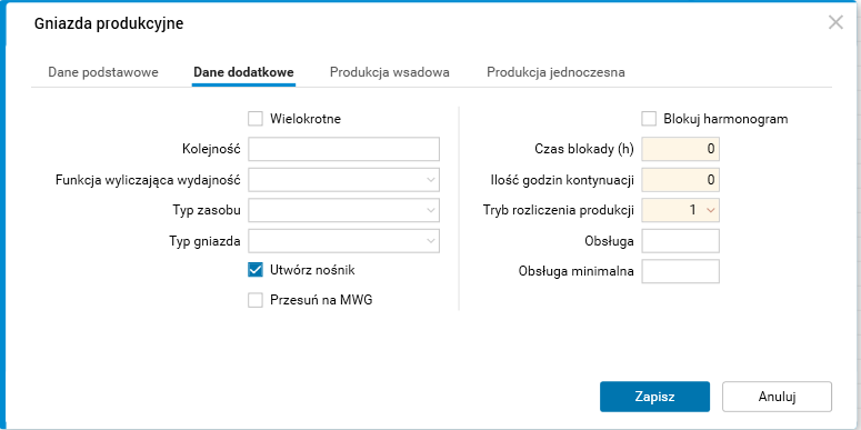 W słowniku Gniazda produkcyjne zostały dodane znaczniki Utwórz nośnik (pozwala on włączyć funkcjonalność generowania nośnika dla przyjmowanej produkcji, realizowanej na danym gnieździe) oraz Przesuń na MWG (pozwala on włączyć funkcjonalność generowania przesunięcia przyjmowanej produkcji realizowanej na danym gnieździe na magazyn wyrobów gotowych). Pozwalają one włączyć funkcjonalności generowania nośnika i przesunięcia na MWG (magazyn wyrobów gotowych) dla przyjmowanej produkcji realizowanej na danym gnieździe.