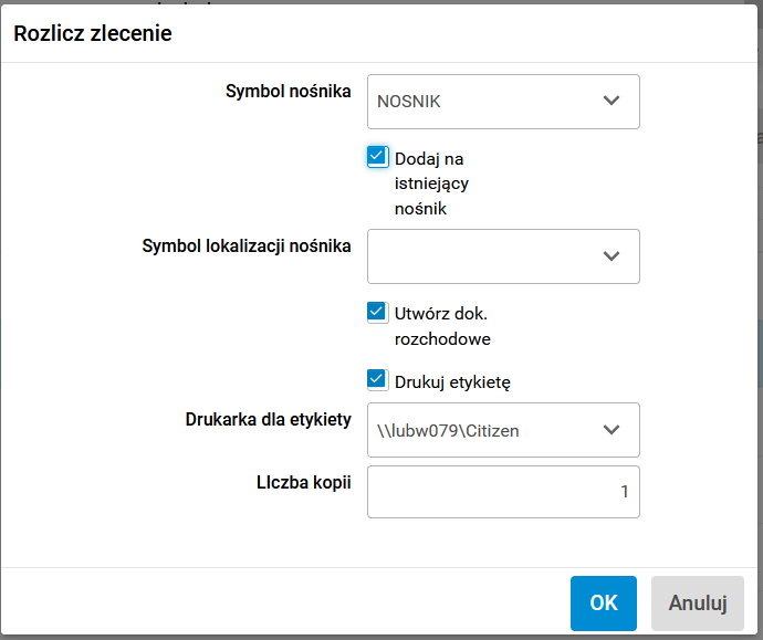 Na terminalu dotykowym dla zleceń realizowanych na gnieździe z ustawionym znacznikiem Utwórz nośnik, po uruchomieniu procedury Rozlicz zlecenie pojawi się okno z parametrami umożliwiającymi podanie symbolu kartoteki nośnika (pole Symbol nośnika), ewentualnego symbolu nośnika (pole Symbol lokalizacji nośnika) oraz pole wyboru (znacznik Utwórz dok. rozchodowe), którego zaznaczenie umożliwia wygenerowanie dokumentów przesunięcia na magazyn wyrobów gotowych. Przy zaznaczonej opcji Utwórz dok. rozchodowe pojawią się również pola umożliwiające podanie parametrów dla wydruku etykiety nośnika (znacznik Drukuj etykietę, pole Drukarka dla etykiety, pole Liczba kopii).