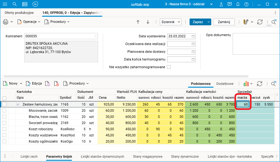 Wyznaczanie ceny sprzedaży na ofercie produkcyjnej na podstawie zadanej marży