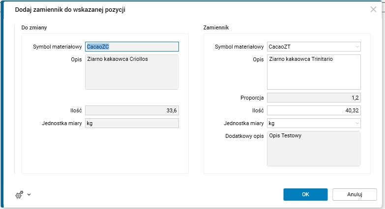 W parametrach procedury operator może zmienić symbol materiałowy zamiennika, ilość, jednostkę miary.