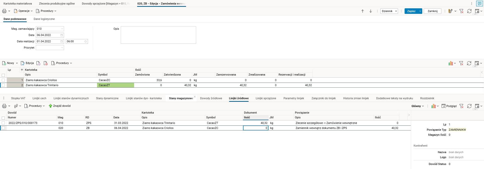 · Utworzenie powiązań między surowcem i zamiennikami na dokumencie ZB oraz powiązań tych pozycji z ich odpowiednikami na dokumencie ZPS.