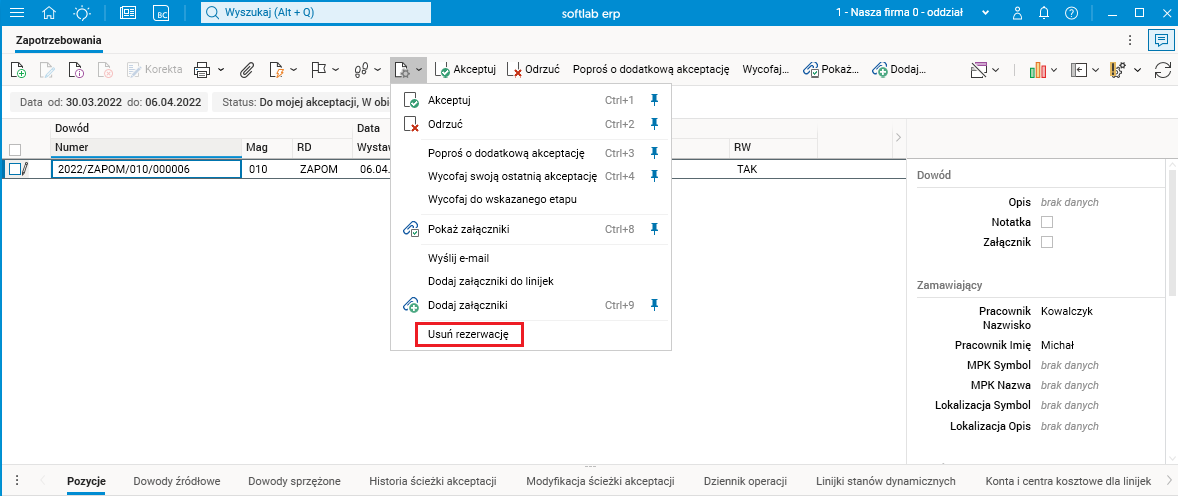 W systemie Softlab ERP by Asseco ułatwiono możliwość zdjęcia rezerwacji z zapotrzebowania w słowniku Zapotrzebowania. Funkcjonalność jest dostępna dla dowodów zapotrzebowania (ZAPOM), które mają założoną rezerwację towaru na stanie magazynowym.
