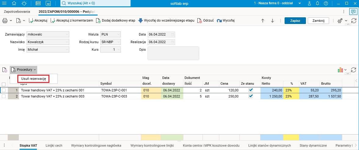 W słowniku Zapotrzebowania została dodana procedura Usuń rezerwację, która jest dostępna w nagłówku i na linijkach dowodu.