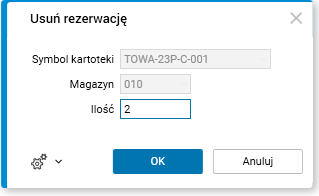 Użycie tej procedury w nagłówku dowodu skutkuje usunięciem wszystkich rezerwacji z całego zamówienia. Z kolei użycie procedury na linijce otwiera okno parametrów procedury, w którym wskazujemy ilość rezerwacji do usunięcia z wybranej linijki.