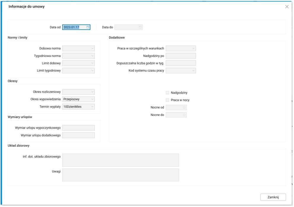Rys. Szczegół Informacje do umowy pracownika w słowniku Pracownicy – umowy(etaty) – niezaznaczona opcja Praca w nocy