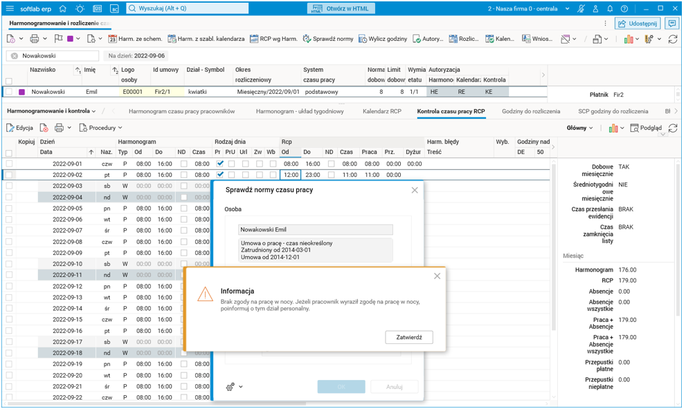 W procedurze Sprawdź normy czasu pracy dostępnej w słowniku Harmonogramowanie i rozliczenie czasu pracy dodano kontrolę pracy w godzinach nocnych, zarejestrowanej w kalendarzu RCP.