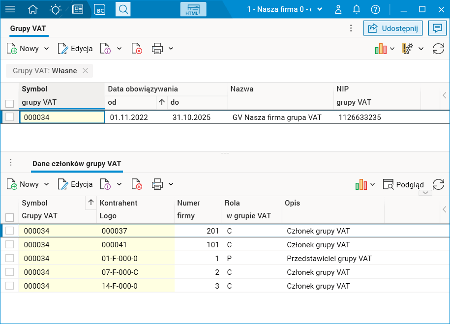 - nazwę oraz logo grupy VAT, NIP oraz okres obowiązywania grupy,