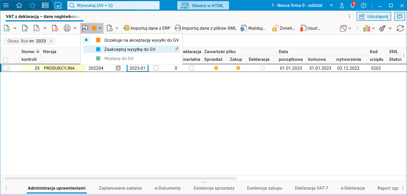 Po zaakceptowaniu wszystkich ewidencji jednostkowych należy przejść do firmy zbiorczej, założyć w niej nowy nagłówek kontroli JPK VAT z deklaracją i wykonać następujące czynności: