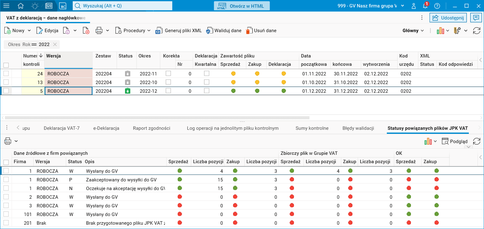 Aby przygotować zbiorczą ewidencję sprzedaży i zakupów dla grupy VAT należy wcześniej przygotowywać i zatwierdzić jednostkowe ewidencje sprzedaży i zakupów dla każdego z członków grupy. Proces ten składa się z kilku czynności: