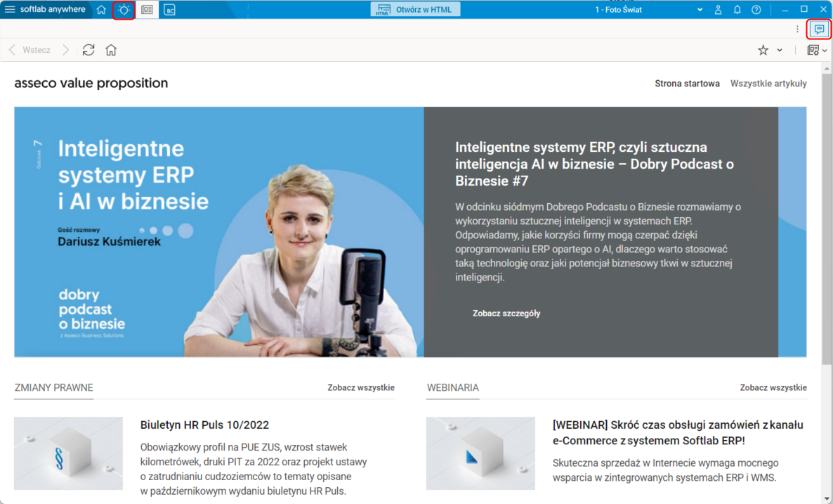 W celu wywołania Asystenta należy wybrać przycisk z ikoną żarówki na górnym pasku aplikacji lub przycisk z chmurką dialogową w prawym górnym rogu ekranu.