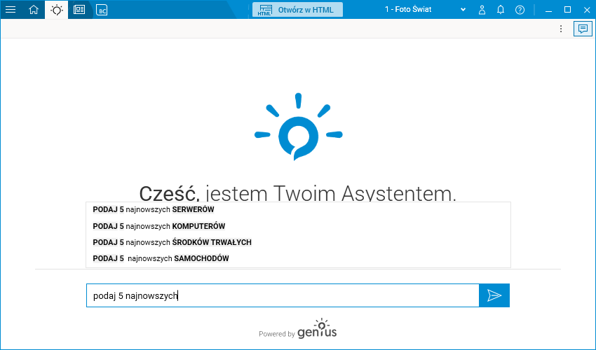 Po uruchomieniu Asystenta użytkownik może wprowadzić zapytanie w pasku wyszukiwania. Podczas wprowadzania przez użytkownika kolejnych słów system będzie dynamicznie wyświetlał najbliższe skojarzenia i podpowiedzi.