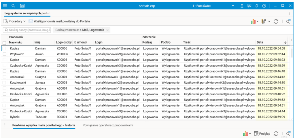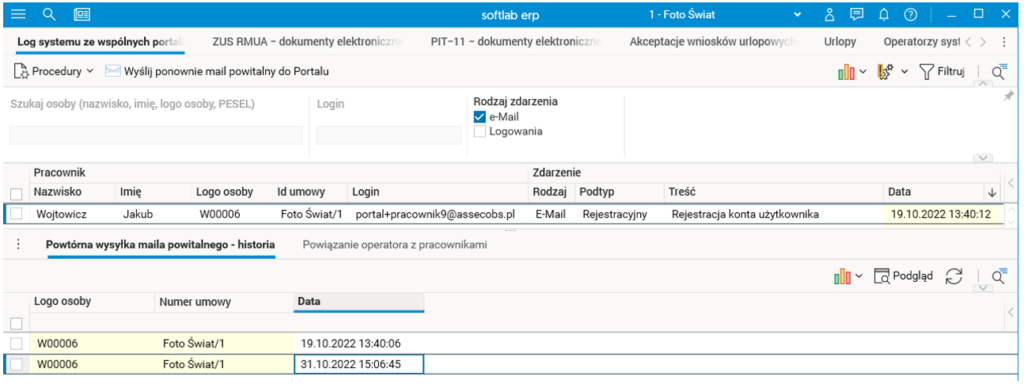 Ponowna wysyłka maila rejestracyjnego do Portalu HR jest za każdym razem rejestrowana i powoduje utworzenie wpisu w szczególe Ponowna wysyłka maila powitalnego – historia.