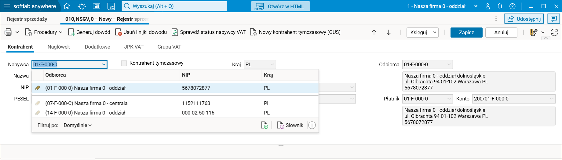 • Członek grupy VAT – wystawca – dane wystawcy faktury (członka grupy VAT); dane są wypełniane na podstawie kontrahenta przypisanego do firmy, w której rejestrowany jest dokument,