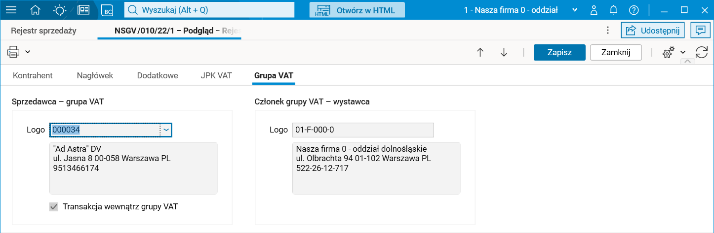 Nowa zakładka Grupa VAT w nagłówku dokumentu zawiera nieedytowalne dane o podmiocie, który dokonał sprzedaży, czyli:
