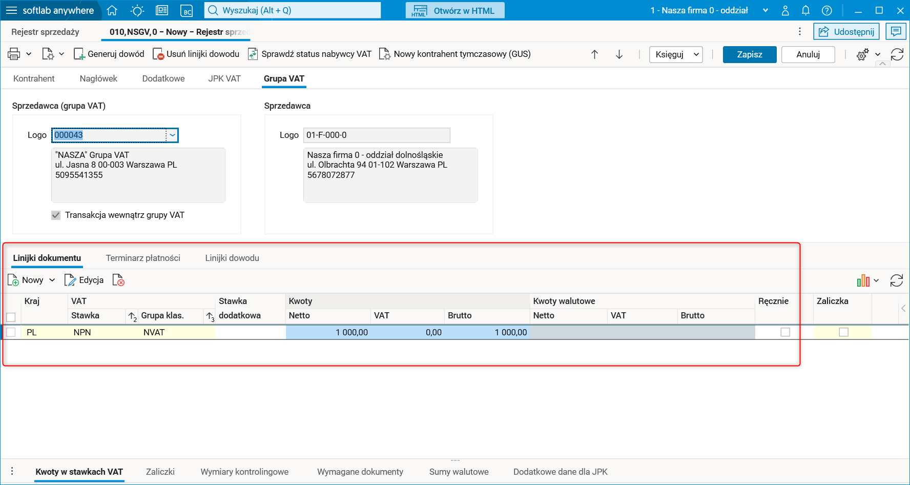 Dalsze kroki są identyczne jak w przypadku operacji sprzedaży dla członka grupy VAT.