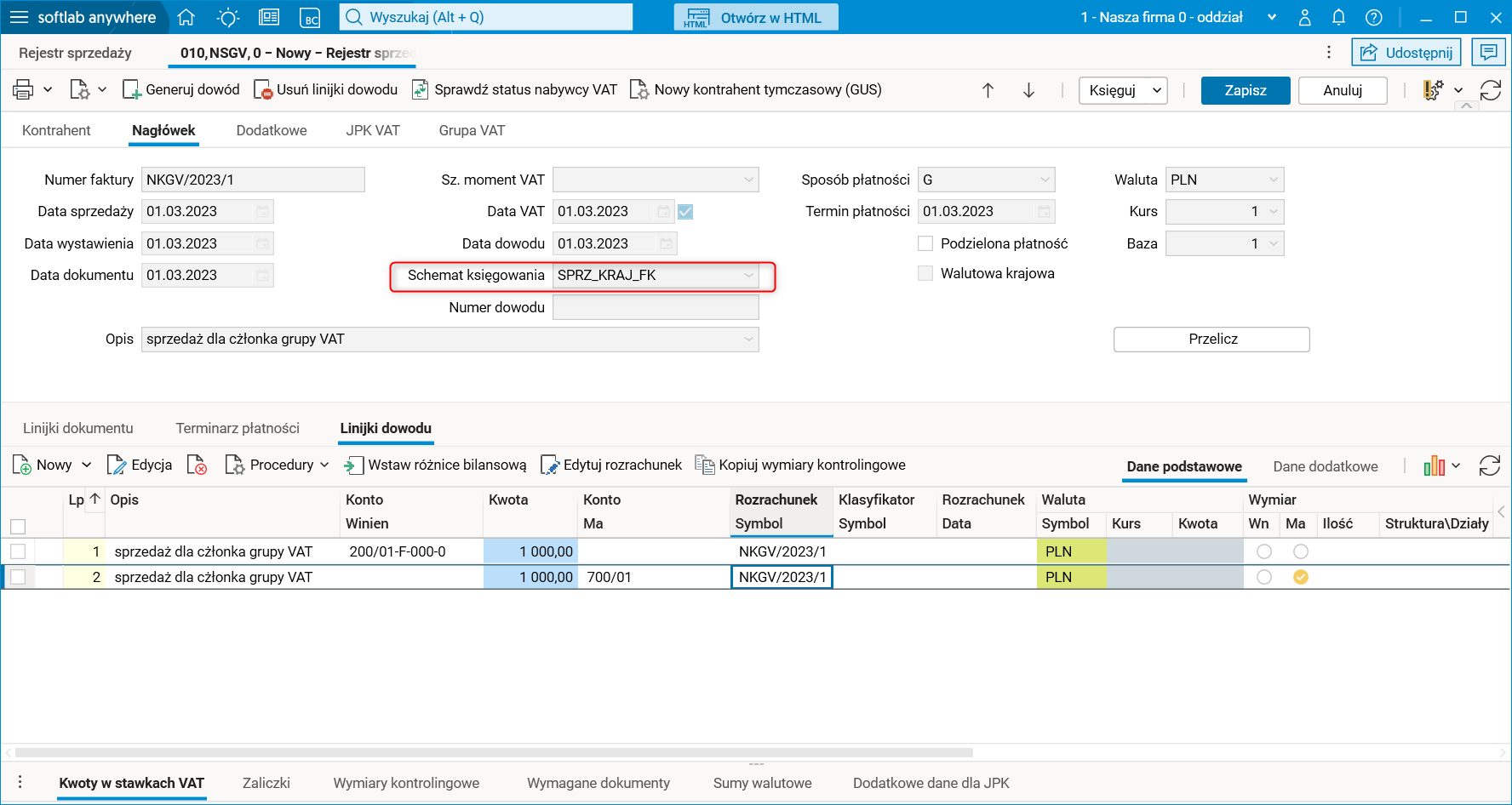 Po uzupełnieniu linijki dokumentu, możemy zaksięgować dokument takim samym schematem księgowania, jaki był stosowany dla sprzedaży krajowej, jeśli na kontach przychodowych nie zostały wydzielone odrębne analityki dla transakcji wewnątrz grupy. Jeśli takowe istnieją, to należy zdefiniować nowy schemat księgowania.