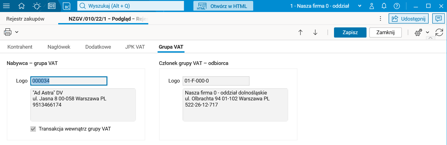 Rejestrowanie operacji wykonywanych wewnątrz grupy VAT