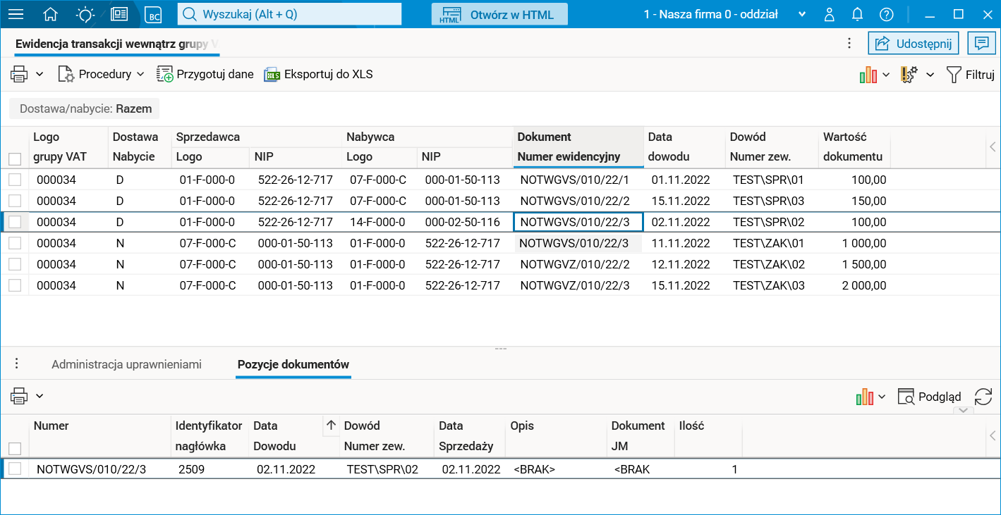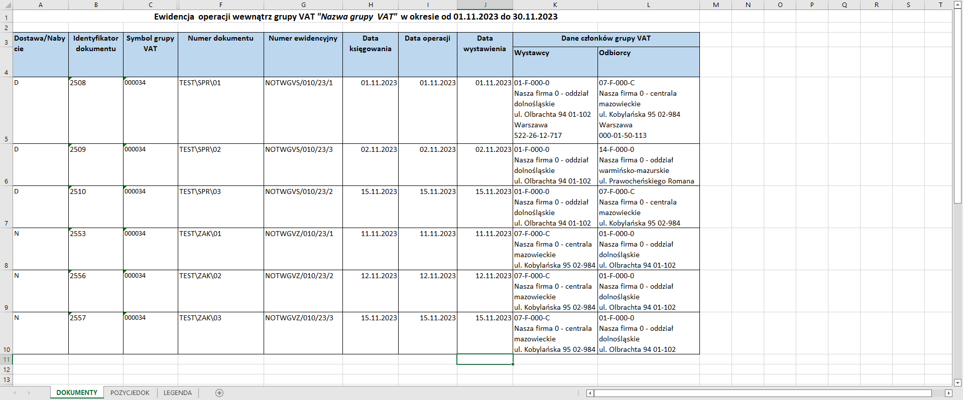 Źródłem ewidencji transakcji wewnątrz grupy w systemie Softlab ERP będą opisane w poprzednim punkcie dokumenty, a elektroniczny format otrzymamy poprzez eksport danych do pliku XLS.