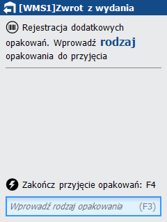 Ekran rejestracji opakowań zostanie wyświetlony po zakończeniu wprowadzania towarów do zwrotu (klawisz funkcyjny <F8>).