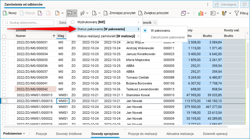 W słowniku Zamówienia od odbiorców został dodany nowy status dokumentu ZO – Status pakowania. Domyślnie dokument ZO otrzymuje status W pakowaniu. Oznacza to, że taki dokument będzie widoczny w aplikacji WMS Client podczas wyboru dokumentu w procesie komasacji.