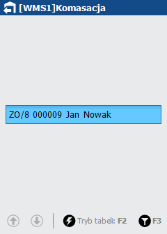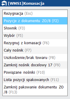 Wymienione opcje są dostępne po wyborze dokumentu ZO, dla którego chcemy przeprowadzić komasację, na ekranie wprowadzania kodu kreskowego towaru do przepakowania. Listę wszystkich dostępnych opcji możemy wyświetlić na tym samym ekranie używając klawisza funkcyjnego <F1>.