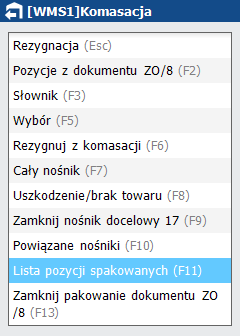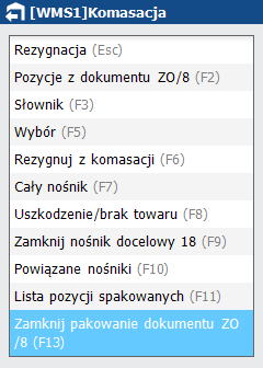·         Zamknij pakowanie dokumentu ZO (klawisz funkcyjny <F13>) umożliwia zakończenie pakowania towarów z wybranego dokumentu ZO na nowy nośnik.