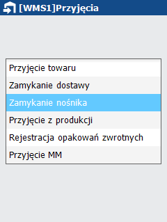 W podmenu przyjęcia w aplikacji WMS Client jest dostępny proces Zamykanie nośnika.