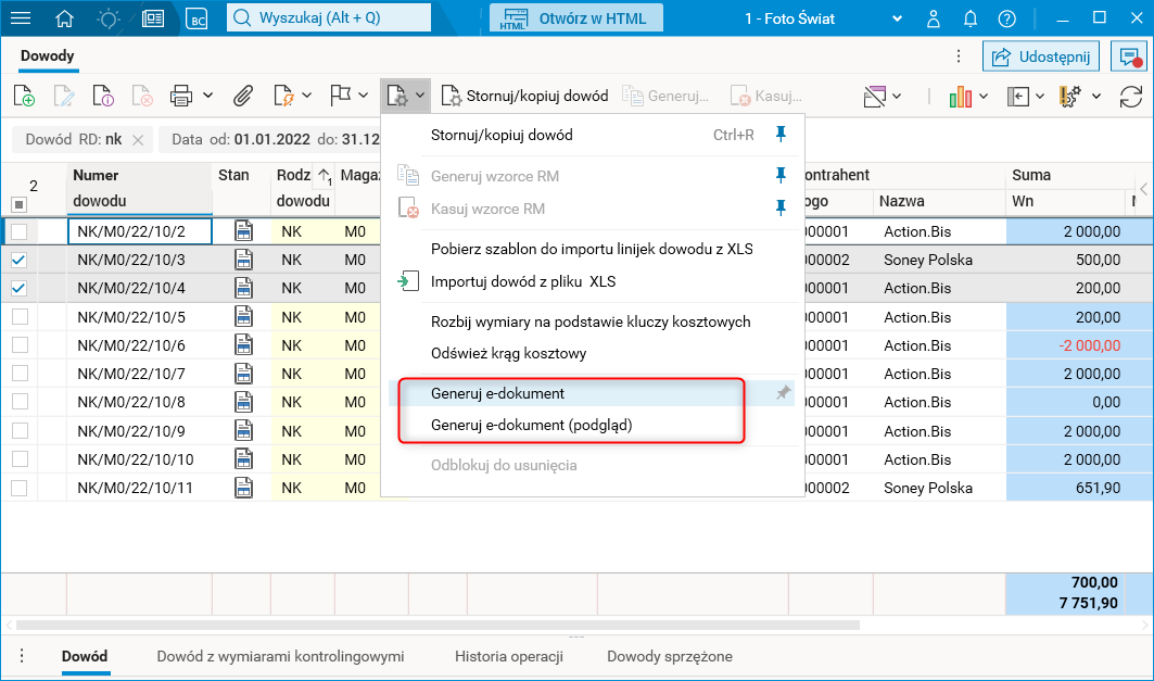 Procedura Generuj e-dokument obsługuje operacje grupowe dla zaznaczonych dokumentów.