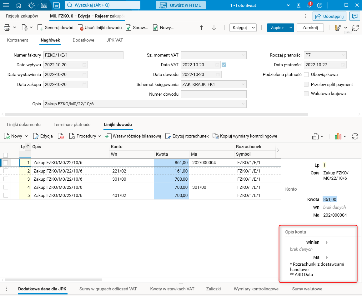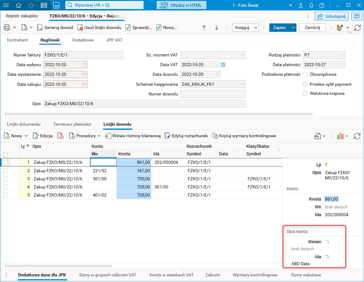 Opis konta jest wyświetlany w oknie edycyjnym dokumentu FK, w linijkach dowodów w panelu bocznym (wersja systemu 2022.1 i wyższe) lub na panelu dolnym (wersje wcześniejsze).