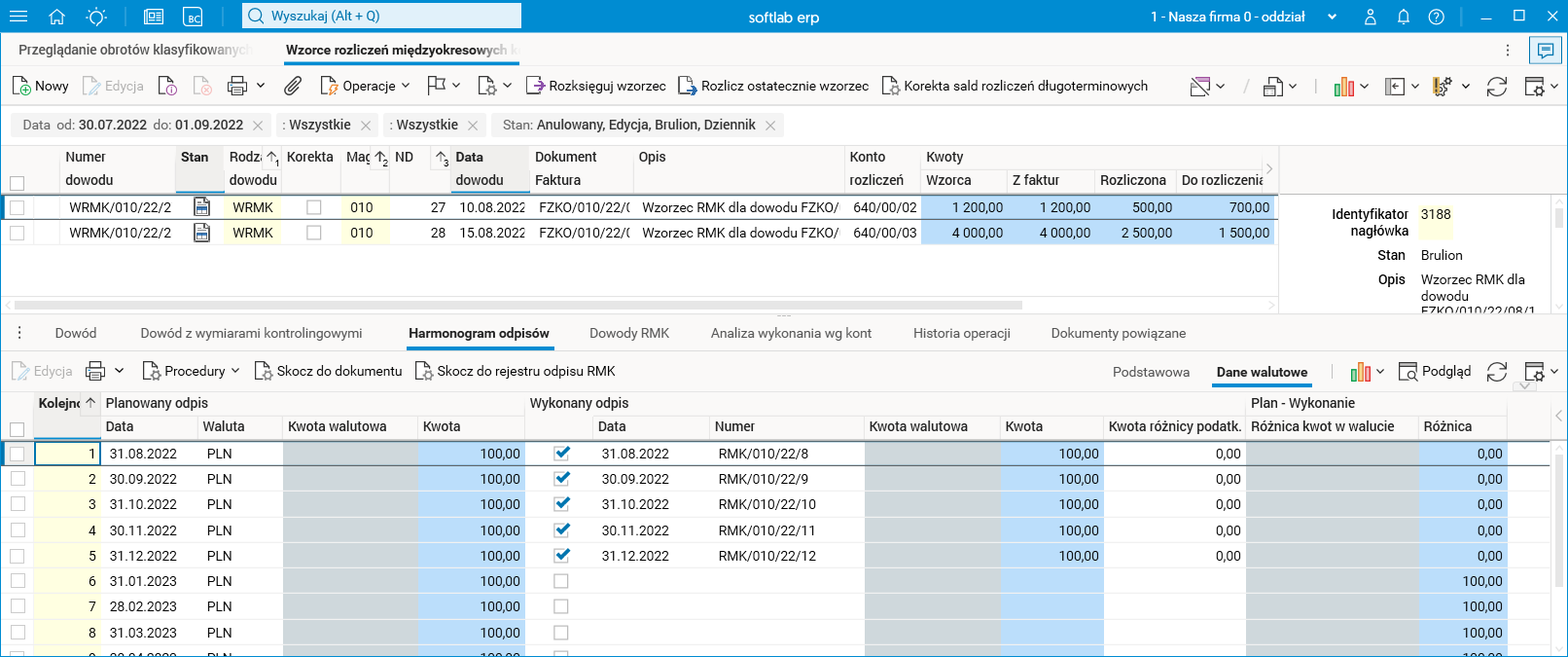 W słowniku Wzorce rozliczeń międzyokresowych kosztów/przychodów możemy przejrzeć wygenerowane wzorce oraz harmonogramy ich odpisów.