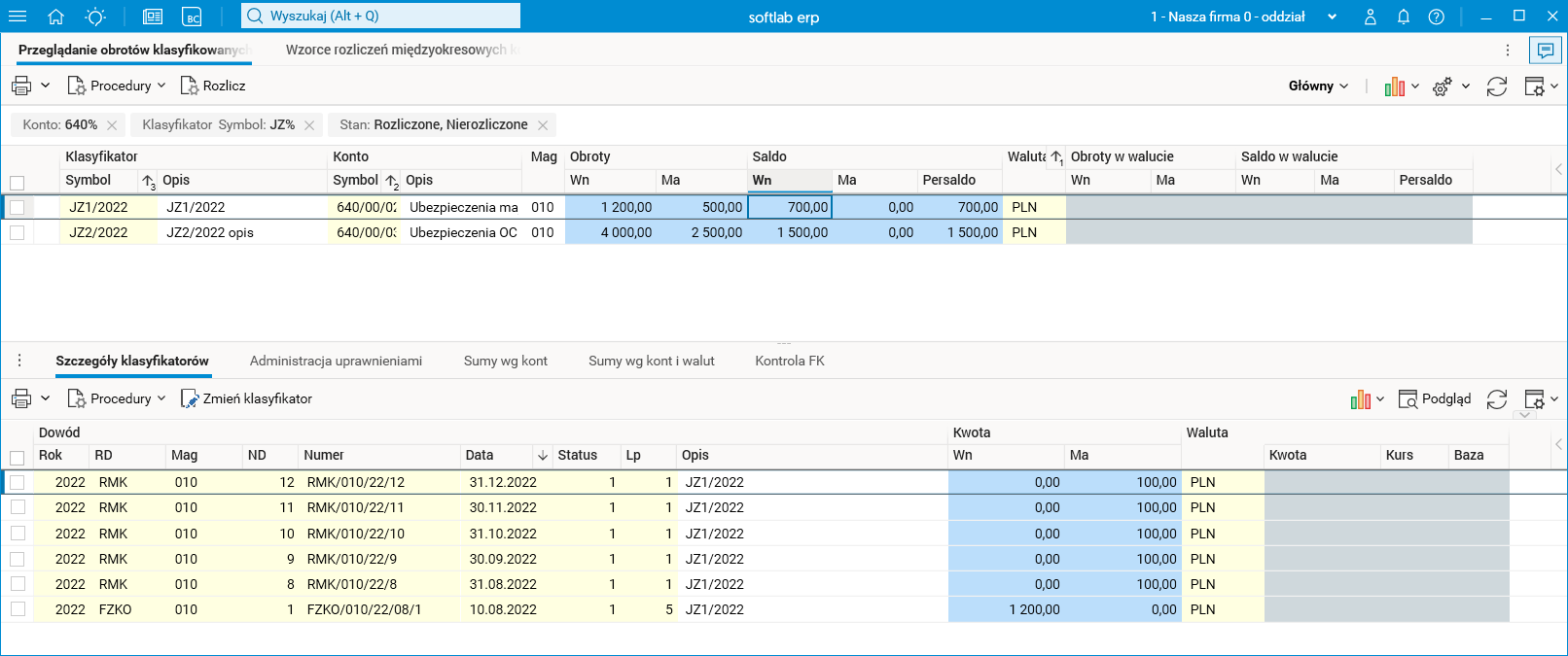Dodatkowo kwota 700 PLN jest również saldem klasyfikatora (widocznego w słowniku Przeglądanie obrotów klasyfikowanych), gdyż konto rozliczeń tego wzorca, czyli 640/00/02 jest kontem klasyfikowanym. Procedura Eksport BO klasyfikatorów (opisana w tym dokumencie w opisie zmiany Eksport / import BO kont klasyfikowanych) nie uwzględni tego klasyfikatora z powodu tego, iż jest to konto RMK/RMP.