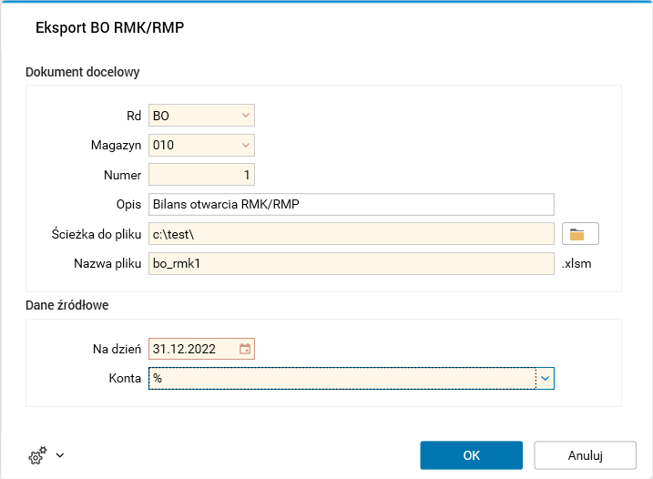 Eksportu wzorców dokonujemy procedurą Eksport BO RMK/RMP. W parametrach procedury w sekcji Dokument docelowy określamy ścieżkę docelową oraz nazwę pliku XLS, który zostanie utworzony przez procedurę. Struktura tego pliku jest zgodna z formatem importu IMPDOK, w związku z czym zawiera informacje opisujące nagłówek i linijki dowodu, niezbędne do jego utworzenia. Ponadto wskazujemy właściwości nagłówka takie jak symbol rodzaju dowodu, symbol magazynu, numer i opis. W sekcji Dane źródłowe określamy, na jaki dzień chcemy pozyskać dane oraz z jakich kont. W tym przypadku będzie to stan na koniec roku 2022, a więc podajemy 31.12.2022.