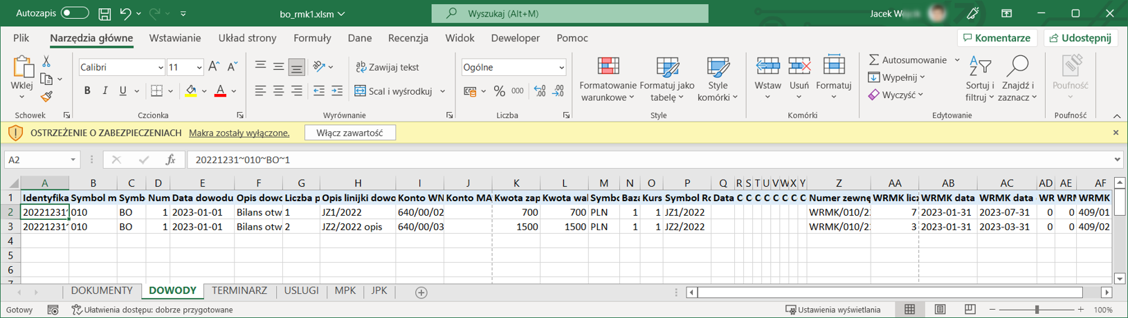Procedura po wygenerowaniu wskazanego pliku XLS automatycznie go otwiera. Każdy wzorzec RMK/RMP zakwalifikowany wedle parametrów procedury zostaje odzwierciedlony w postaci jednego wiersza w pliku XLS w zakładce DOWODY, co oznacza, że będzie stanowić jedną linijkę w dowodzie docelowym.