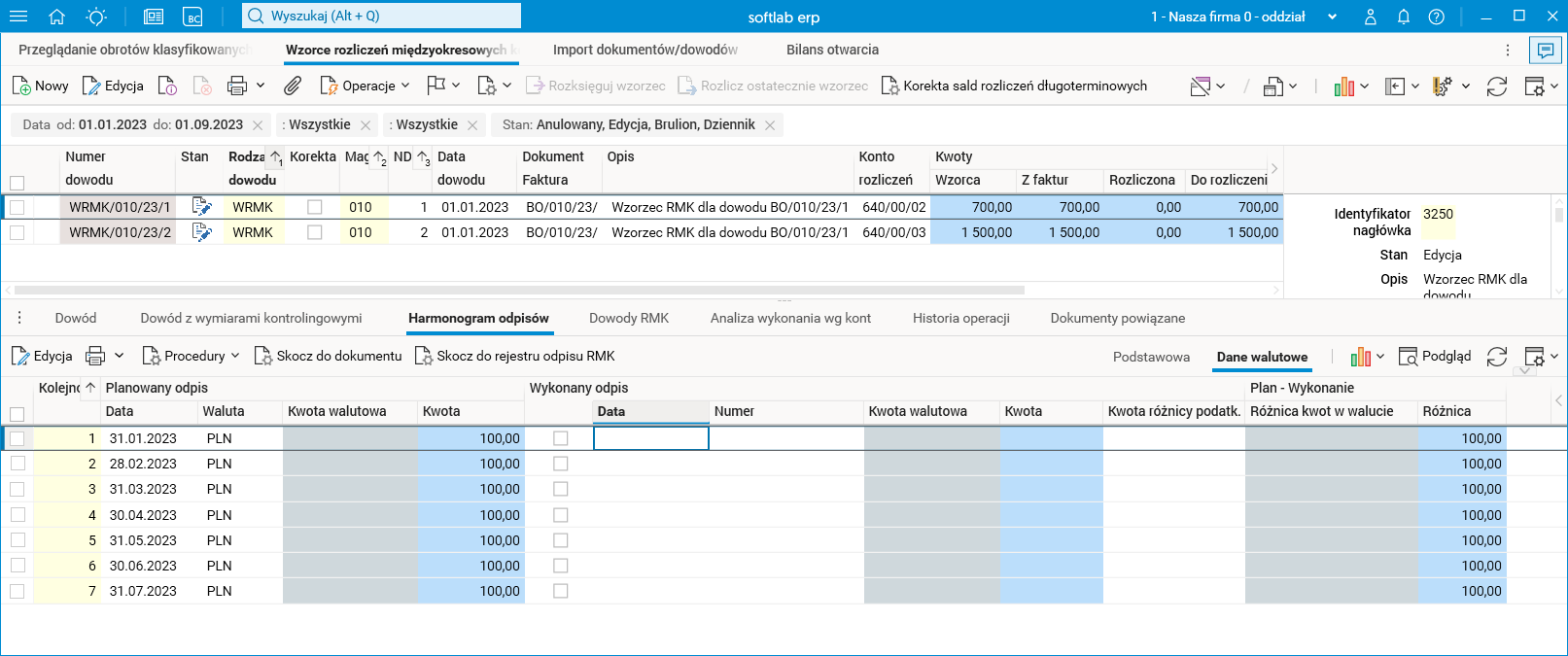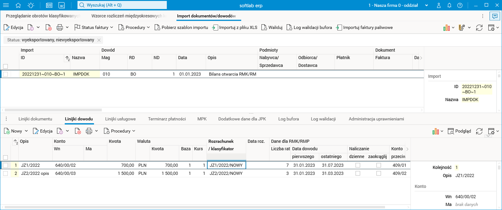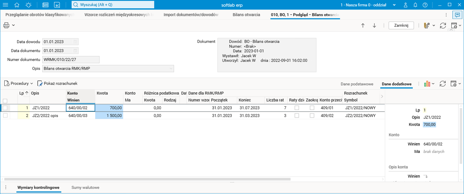 Na bazie docelowej w słowniku Import dokumentów/dowodów importujemy dane za pomocą procedury Importuj z pliku XLS. Pozostawiamy wartość IMPDOK jako nazwę importu i wskazujemy plik do zaimportowania z dysku. W efekcie działania powyższej procedury w słowniku buforowym Import dokumentów/dowodów otrzymamy linijkę nagłówka BO z datą 01.01.2023 (dzień następujący po dniu wybranym w parametrze Na dzień procedury Eksport BO RMK/RMP) oraz dwie linijki w szczególe Linijki dowodu. Każda z tych linijek powstaje na podstawie informacji o wzorcu RMK z bazy źródłowej, a dane widoczne w utworzonej linii są już zaktualizowane. Należy również zauważyć, że nasz przykładowy wzorzec rozpoczyna się w styczniu 2023 i będzie zawierał 7 rat, czyli dokładnie tyle, ile zostało do rozliczenia według harmonogramu odpisów.