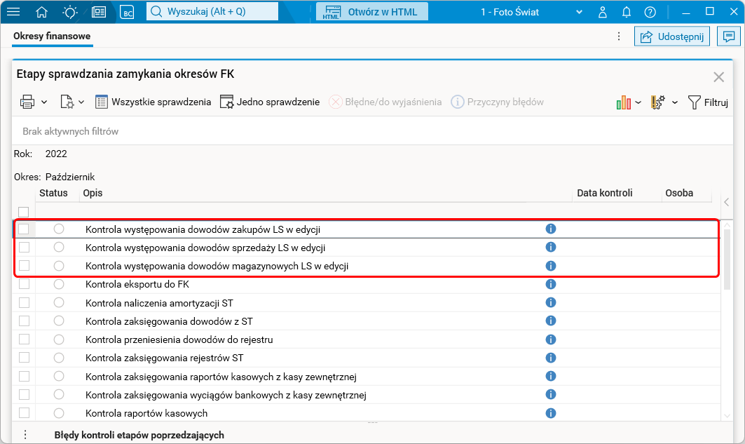 W module FK w słowniku Okresy finansowe wprowadzono dodatkowe kontrole uruchamiane podczas zamykania okresów finansowych, sprawdzają one dokumenty pozostałe w edycji w module LS.