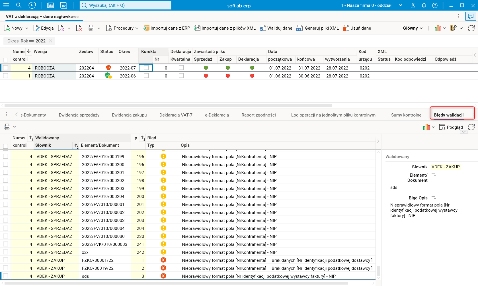 · Walidowany;Element/Dokument – prezentowany jest numer dokumentu sprzedaży lub zakupu, opis pozycji deklaracji albo opis sumy kontrolnej,