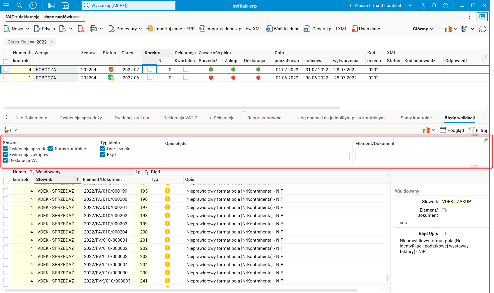Filtry dodatkowe szczegółu pozwalają filtrować według wybranego słownika, typu błędu, opisu błędu lub numeru walidowanego elementu.