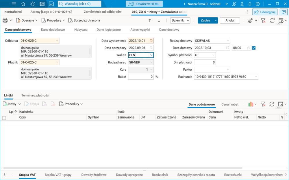 Przykładowo, tworząc zamówienie w dniu 2022.10.01 (sobota) data najbliższej dostawy zostanie zgodnie z konfiguracją dla adresu kontrahenta wyznaczona na 2022.10.03 (poniedziałek), na godzinę 8:00.