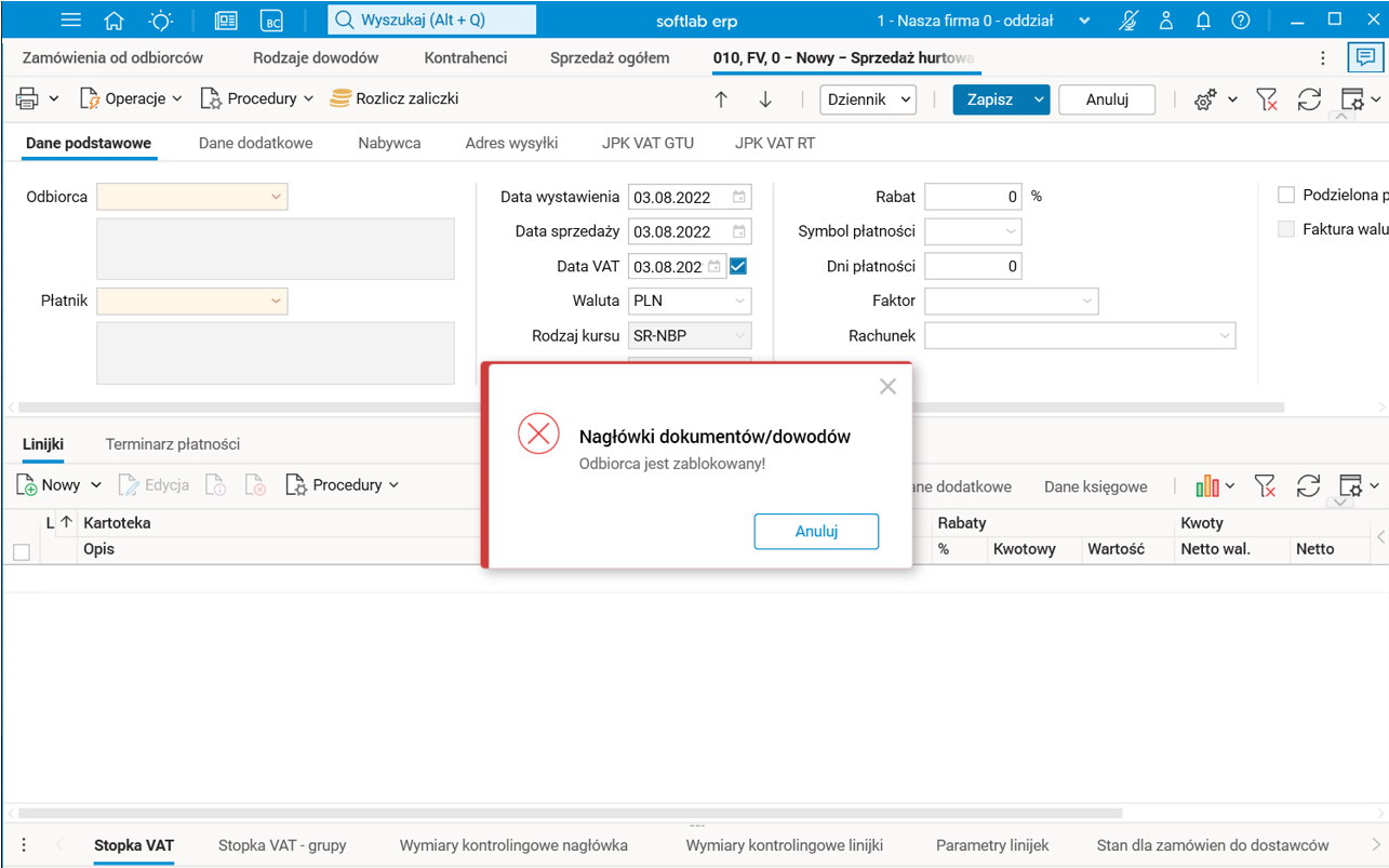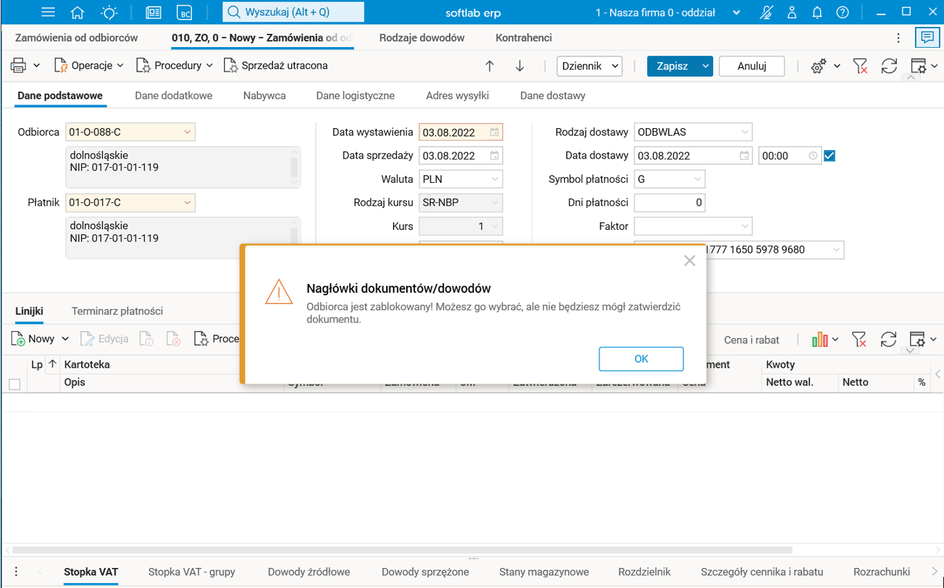 Jeżeli blokada ma zadziałać już w momencie wyboru odbiorcy, od razu wyświetlony zostanie komunikat blokady. Zapisanie takiego dokumentu nie będzie możliwe.