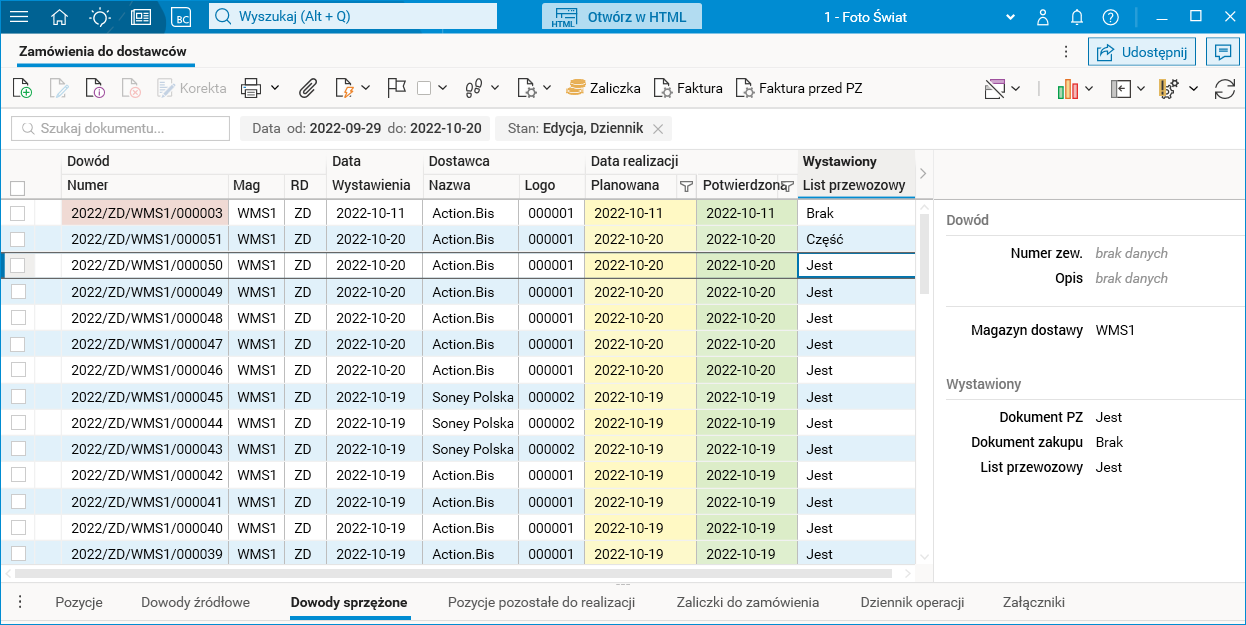Do tej pory informacja ta była wyświetlana w szczególe Dowody sprzężone. W przypadku wielu dokumentów każdorazowe sprawdzanie informacji w szczególe nie było ergonomiczne. Zmianę wprowadzono, aby informacja o wystawionych listach przywozowych była dostępna z poziomu rejestru zamówień do dostawców bez konieczności otwierania szczegółu.
